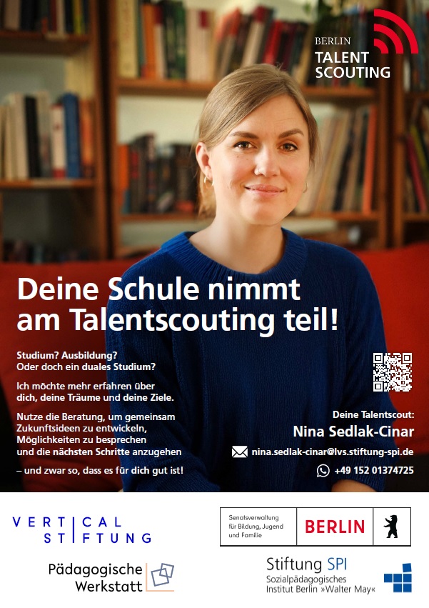Das PROGRAMM TALENTSCOUTS ist ein Beratungsformat, das im Bereich der Übergangsgestaltung von der Schule in die Ausbildung beziehungsweise ins Studium ansetzt. Entwickelt wurde das Konzept vor über einem Jahrzehnt in Nordrhein-Westfalen. Dort beraten rund 100 zertifizierte Talentscouts flächendeckend 30.000 Schüler:innen an rund 550 Berufskollegs, Gesamtschulen und Gymnasien und begleiten sie bei ihrem Übergang in die Berufsausbildung oder ein (duales) Studium bis hinein in den Beruf. Auch Talentscoutin Nina Sedlak-Çınar durchlief im NRW-Zentrum für Talentförderung in Gelsenkirchen die berufsbegleitende Weiterbildung zur zertifizierten Talentscoutin. Weitere Informationen zum Programm finden Sie unter www.talentscouting-berlin.de
